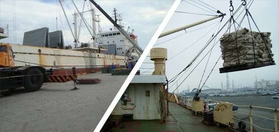 船の中で原料をパレットに積込みをし、それをクレーンでつり上げて下していきます。