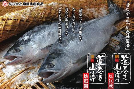 筵巻き山漬け・藁巻き山漬けとは、室町時代のころから伝わる、保存を目的とした塩蔵方法で、今日でいう新巻鮭の語源になったとも言われています。