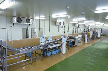 魚種の選別を行い、機械にて、頭、内臓を除去し、等級、サイズ選別を行います。